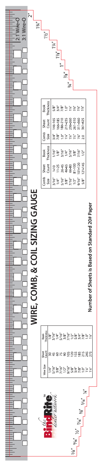 The BindRite Wire, Comb and Coil Sizing Gauge takes the guesswork out of choosing component diameters for most punch and bind applications. This unique tool features sizing guides for Wire-O and Comb on one end and Plastic Coil on the other. The gauge also shows hole patterns for 2:1 and 3:1 pitch Wire-O on one side and patterns for 4:1 pitch Plastic Coil and Comb patterns on the other side.